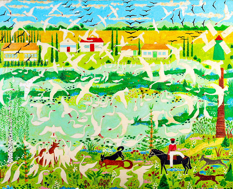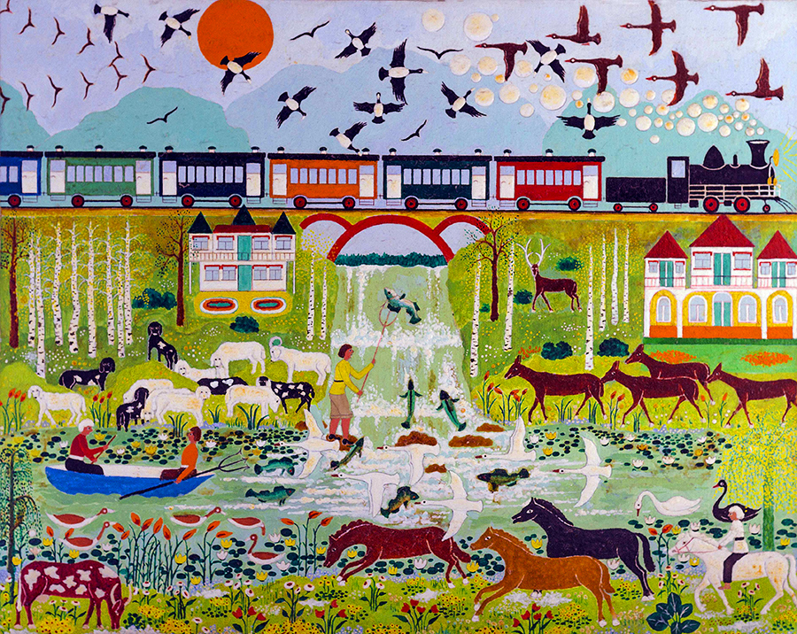 There are eighteen acrylic paintings on canvas. These were created late in George’s life. By this time, with the walls of his room covered and his personal environment complete, he seldom painted. Eventually he acquired canvases and acrylic paints so he again painted, with renewed vigor. He produced iterations of his earlier paintings, along with scenes that he had not previously imaged.