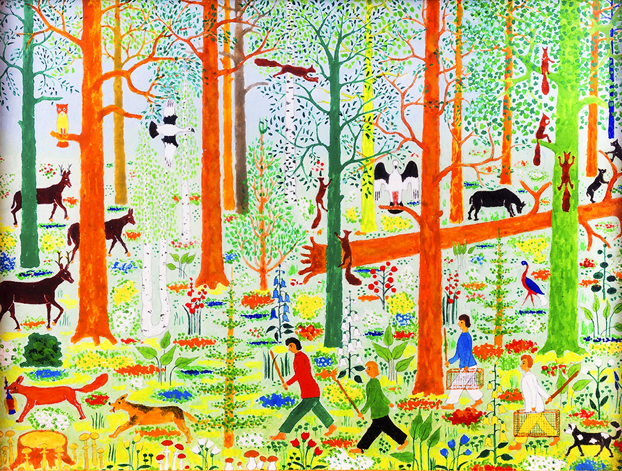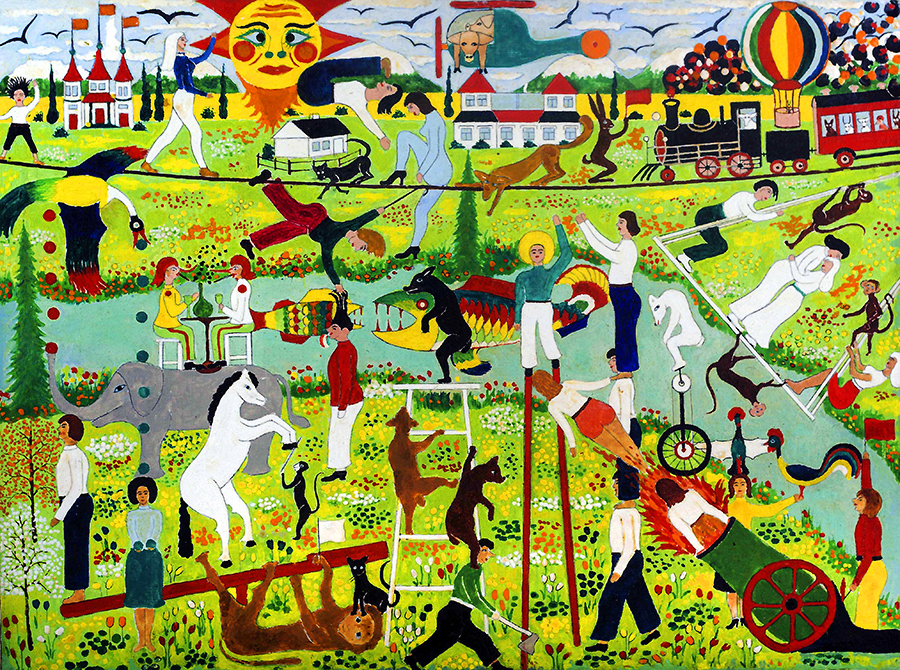 There are eighteen acrylic paintings on canvas. These were created late in George’s life. By this time, with the walls of his room covered and his personal environment complete, he seldom painted. Eventually he acquired canvases and acrylic paints so he again painted, with renewed vigor. He produced iterations of his earlier paintings, along with scenes that he had not previously imaged.